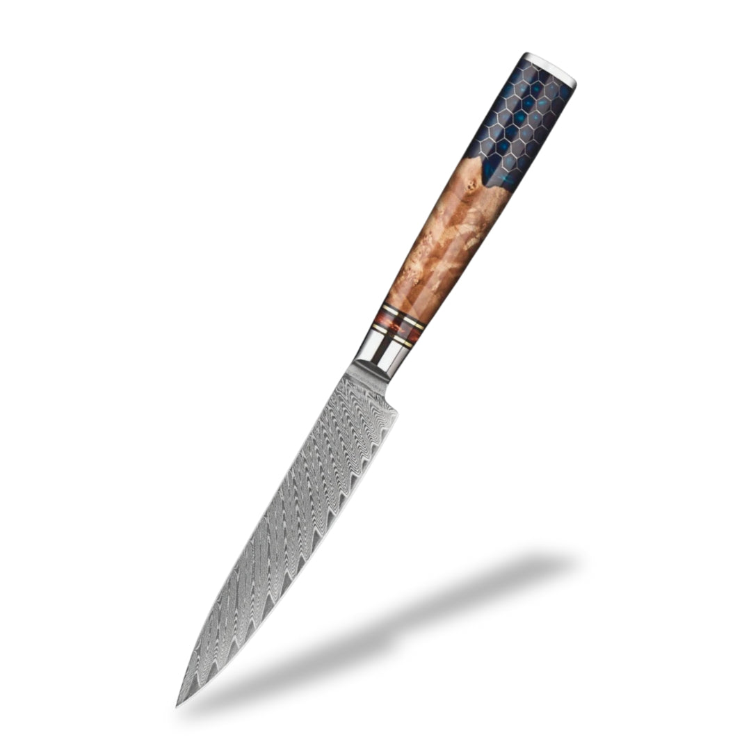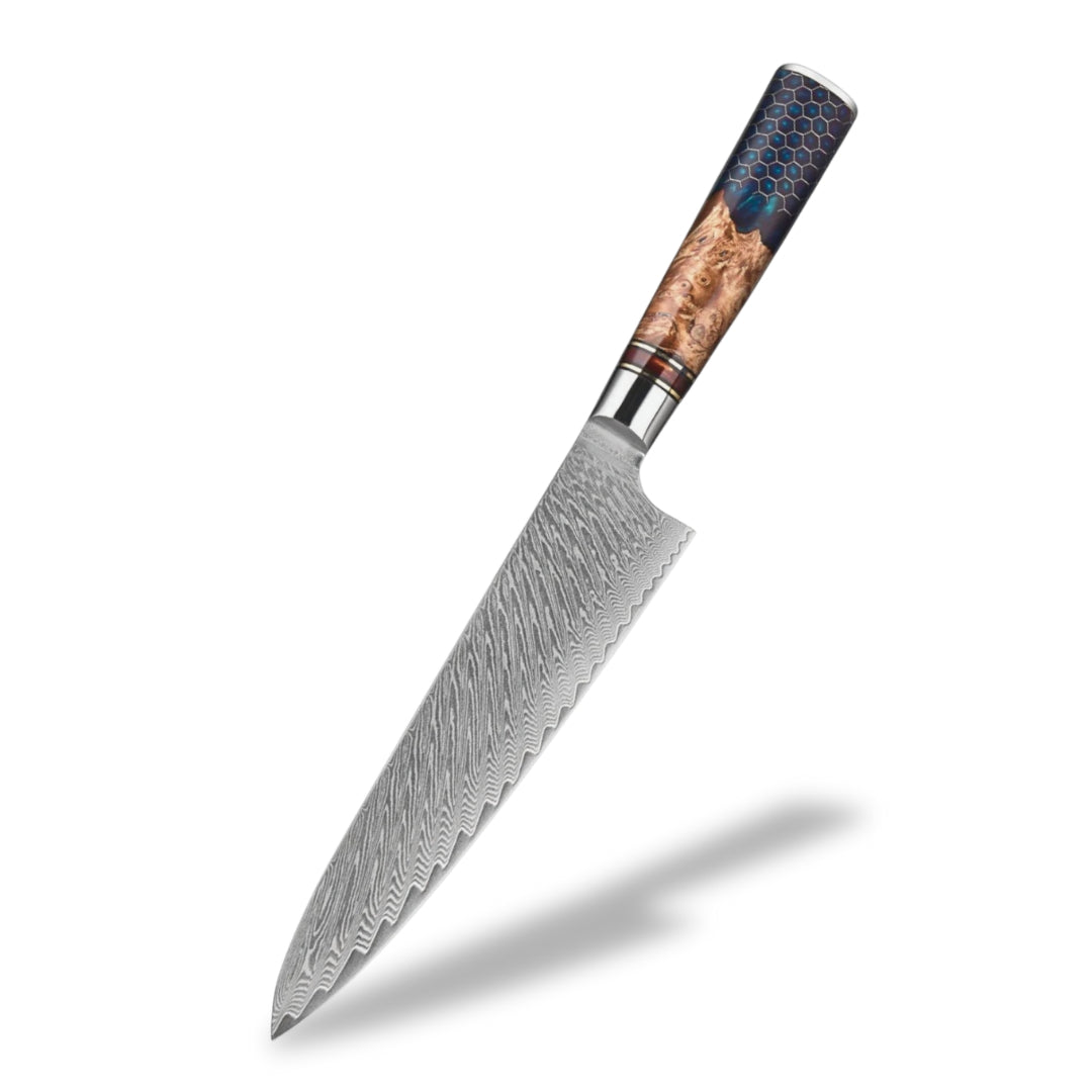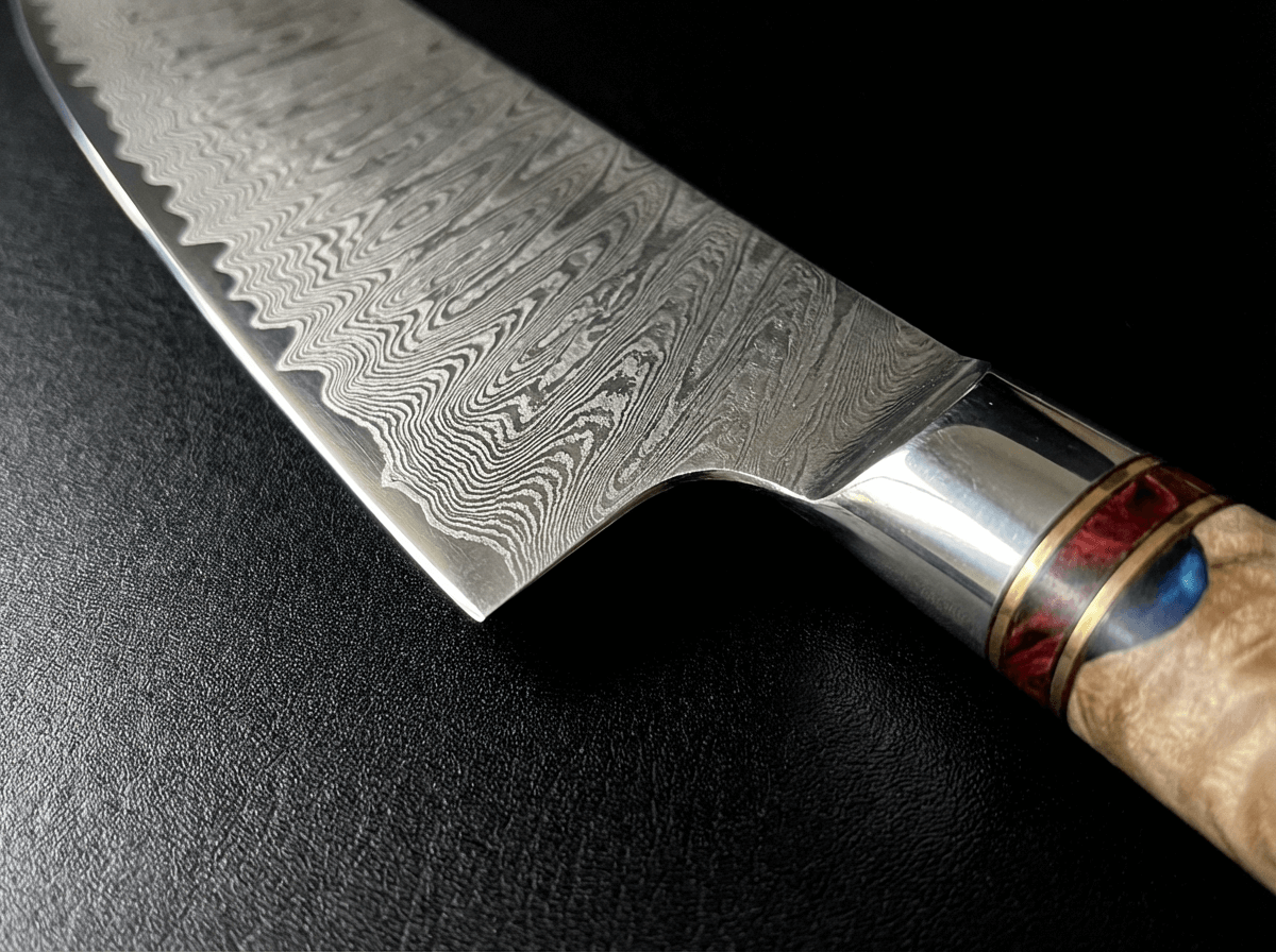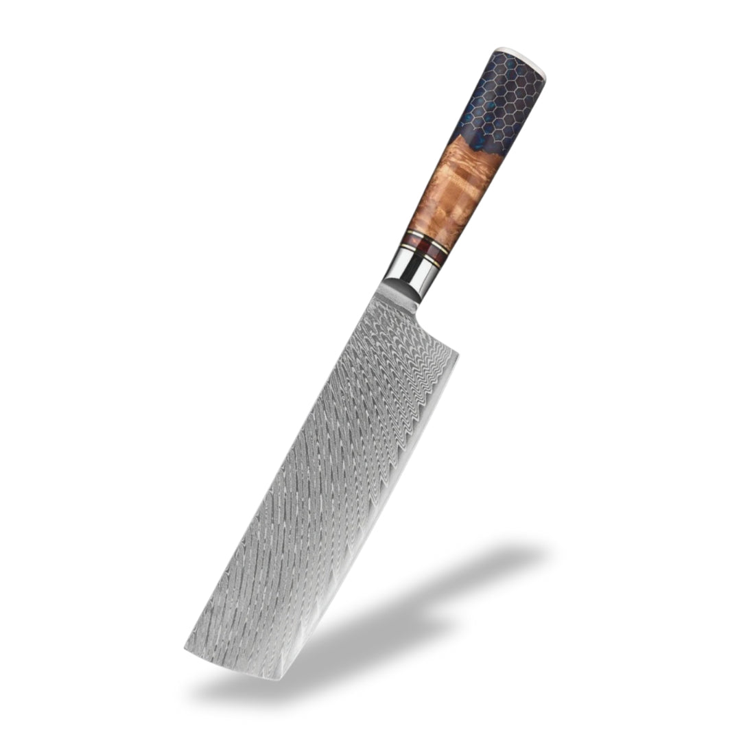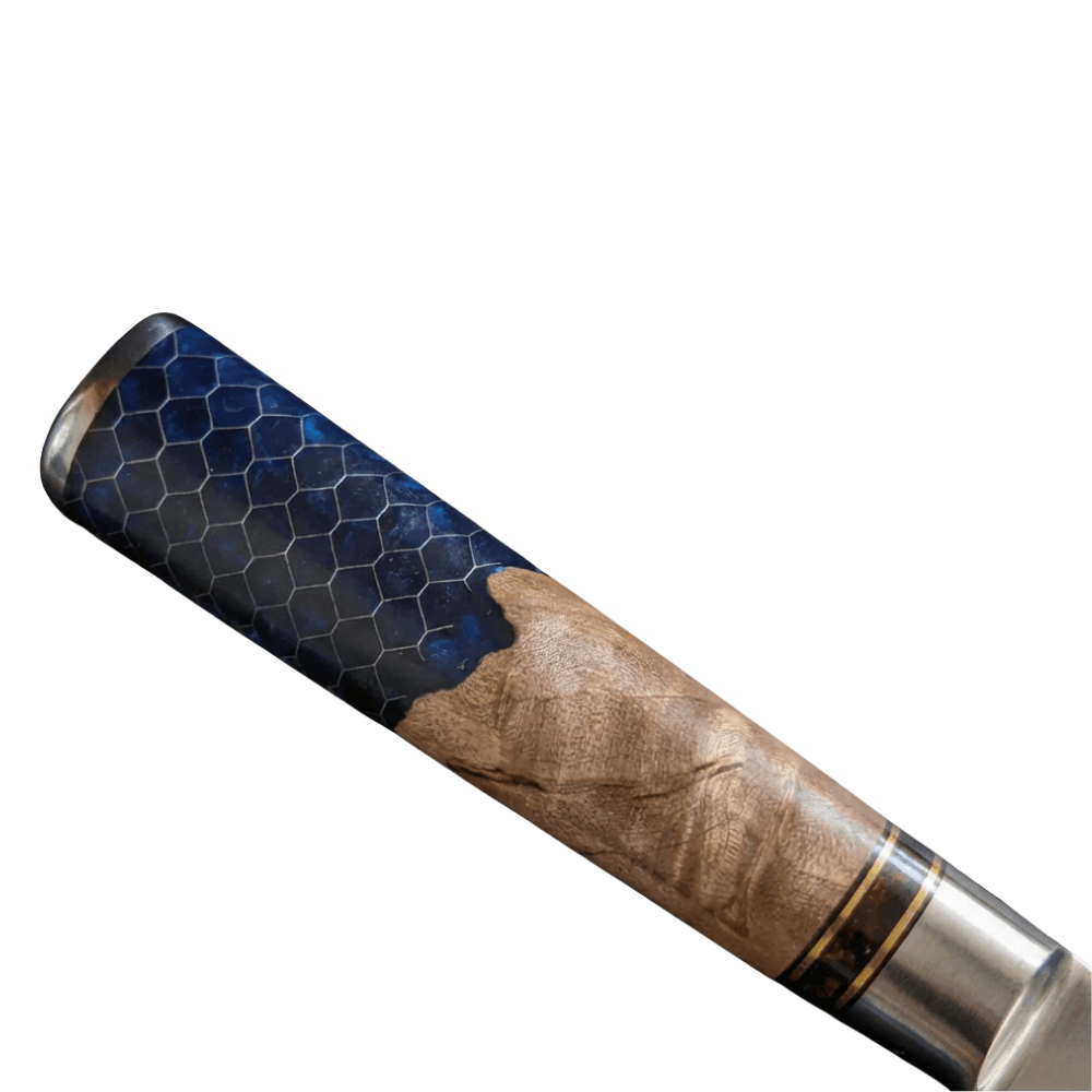 The handle of this knife, crafted from maple root wood and resin, blends natural elegance with high performance. The maple root wood, valued for its strength and natural moisture resistance, is reinforced with resin to ensure long-lasting stability and protection. This unique combination creates a handle with one-of-a-kind patterns and rich colors shaped by nature itself. Its rounded design provides a smooth, comfortable grip, perfect for long hours of effortless use.