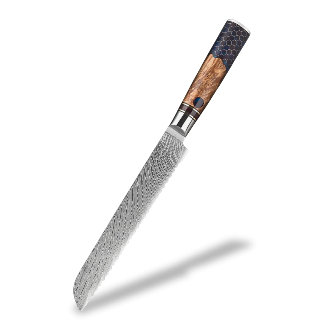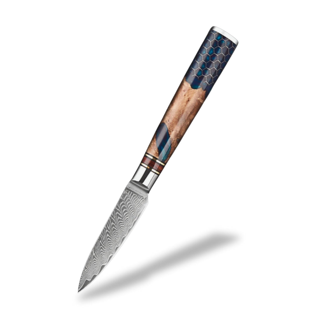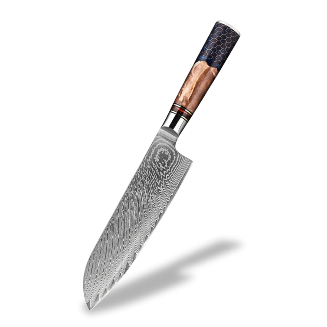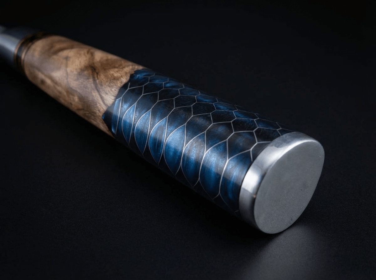 The handle of this knife, crafted from maple root wood and resin, blends natural elegance with high performance. The maple root wood, valued for its strength and natural moisture resistance, is reinforced with resin to ensure long-lasting stability and protection. This unique combination creates a handle with one-of-a-kind patterns and rich colors shaped by nature itself. Its rounded design provides a smooth, comfortable grip, perfect for long hours of effortless use.