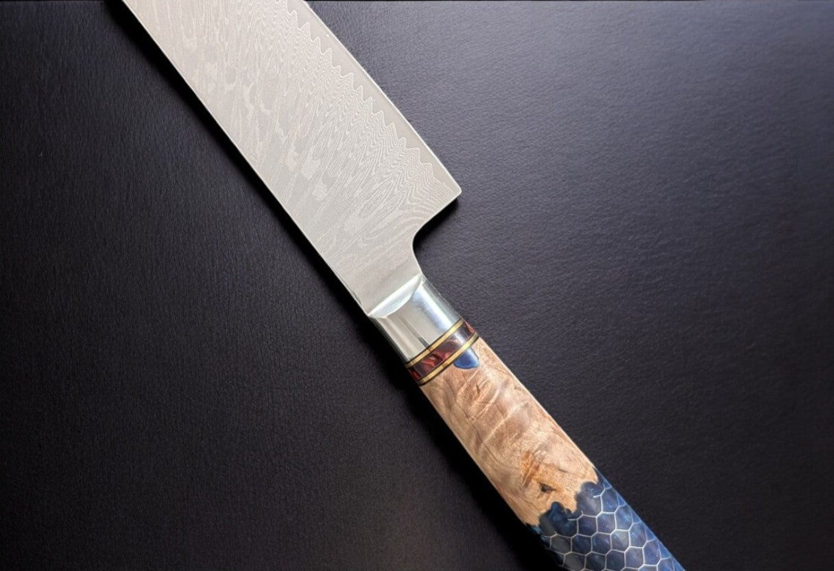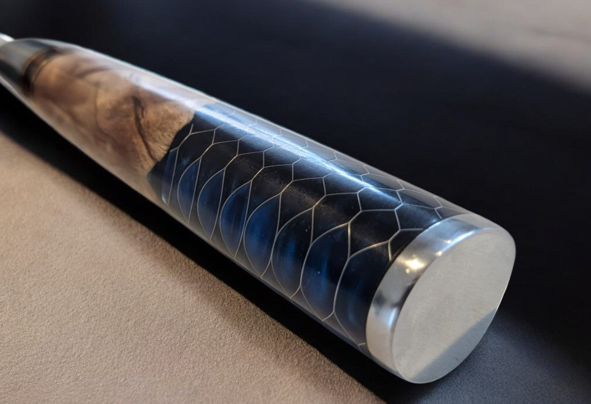 The handle of this knife, crafted from maple root wood and resin, blends natural elegance with high performance. The maple root wood, valued for its strength and natural moisture resistance, is reinforced with resin to ensure long-lasting stability and protection. This unique combination creates a handle with one-of-a-kind patterns and rich colors shaped by nature itself. Its rounded design provides a smooth, comfortable grip, perfect for long hours of effortless use.