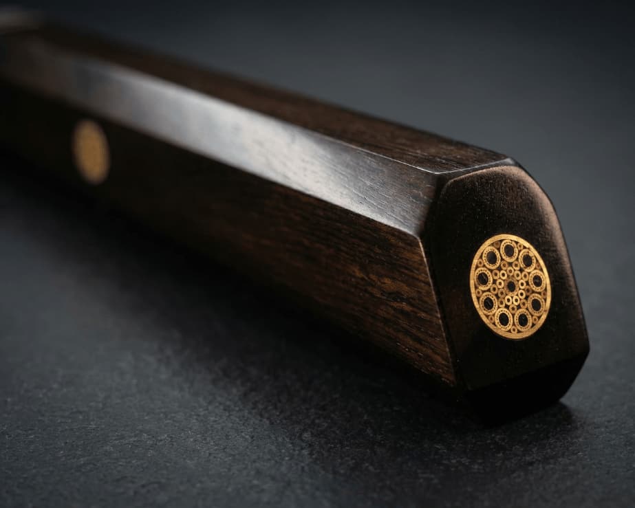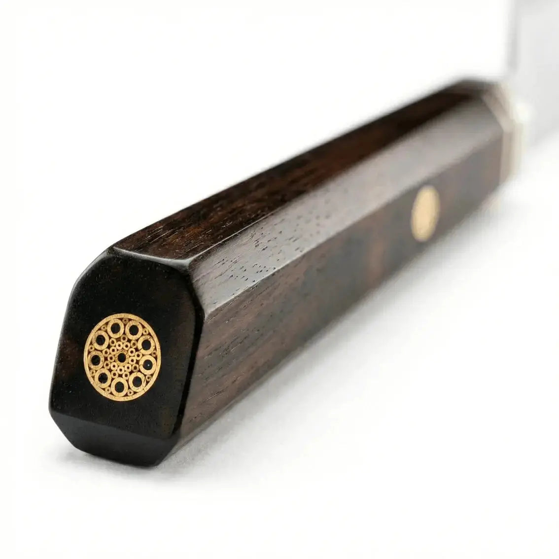 The handle of this knife is crafted from exceptional ebony wood, selected for its rare density and deep black hue, an enduring symbol of refinement and purity. Each piece is meticulously shaped to reveal the material’s natural nobility, with subtle variations that make every handle truly one of a kind.