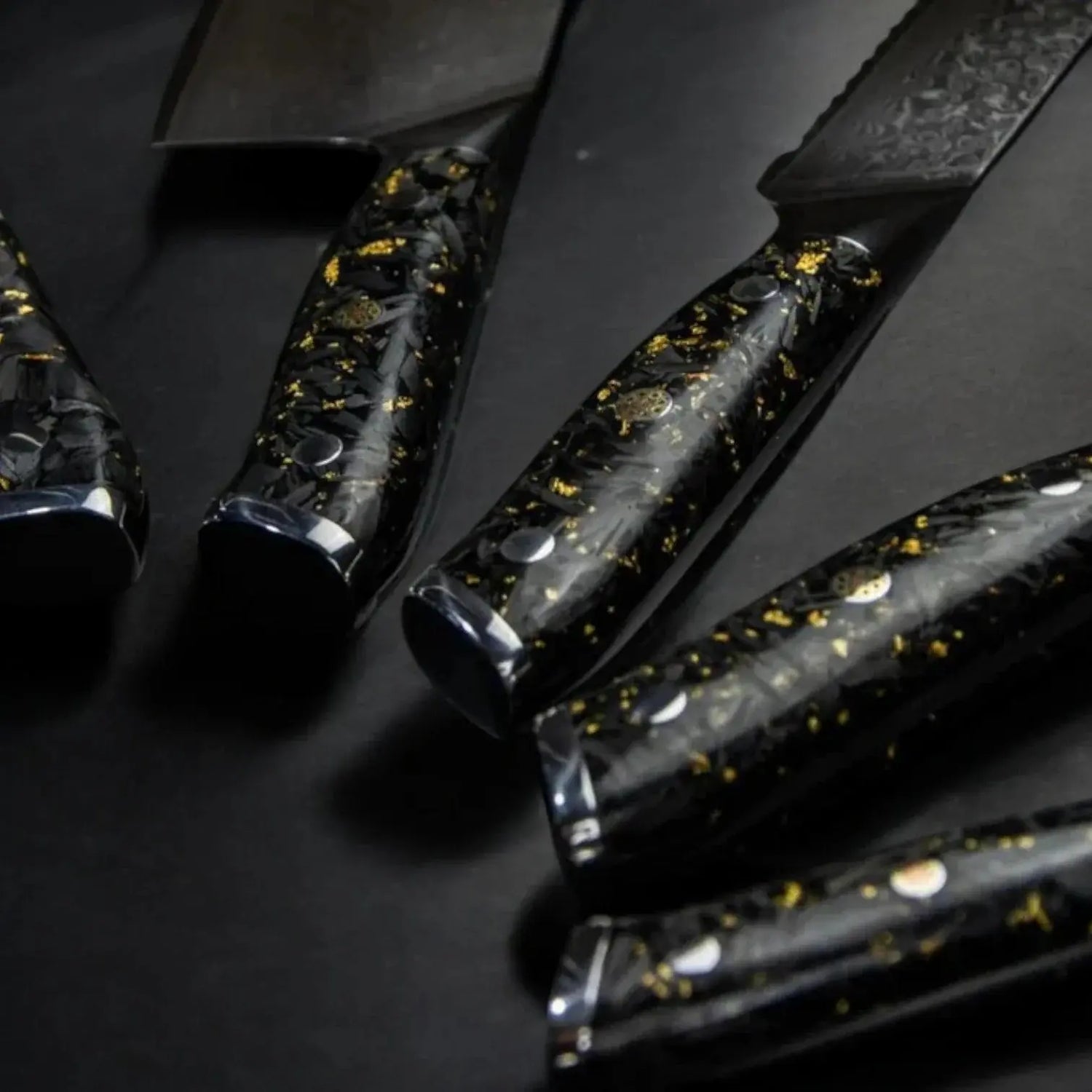 Carbon fiber, chosen for its lightness and exceptional strength, provides unmatched durability while remaining comfortable in hand. The precisely applied gold foil creates unique reflections, turning each handle into a one-of-a-kind masterpiece.