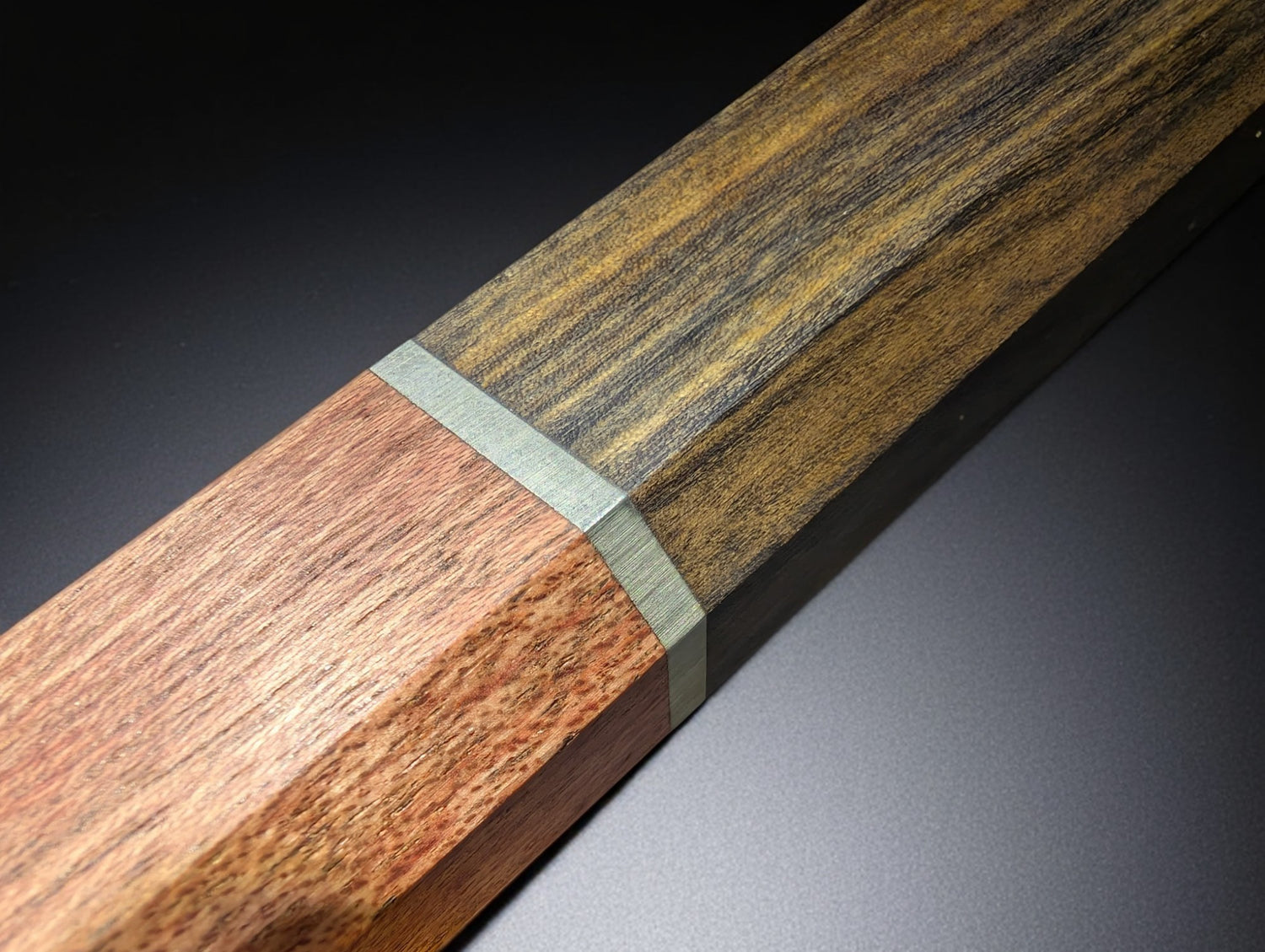 The exotic wood used for this handle stands out for its strength and natural resistance to moisture, making it ideal for versatile use in the kitchen. With its unique grain patterns and rich colors, each piece carries its own character, shaped by nature itself. The hexagonal design offers a comfortable grip, with six facets that naturally fit the hand. In essence, this handle combines the durability of exotic wood with thoughtful craftsmanship, delivering both comfort and longevity for everyday cooking.