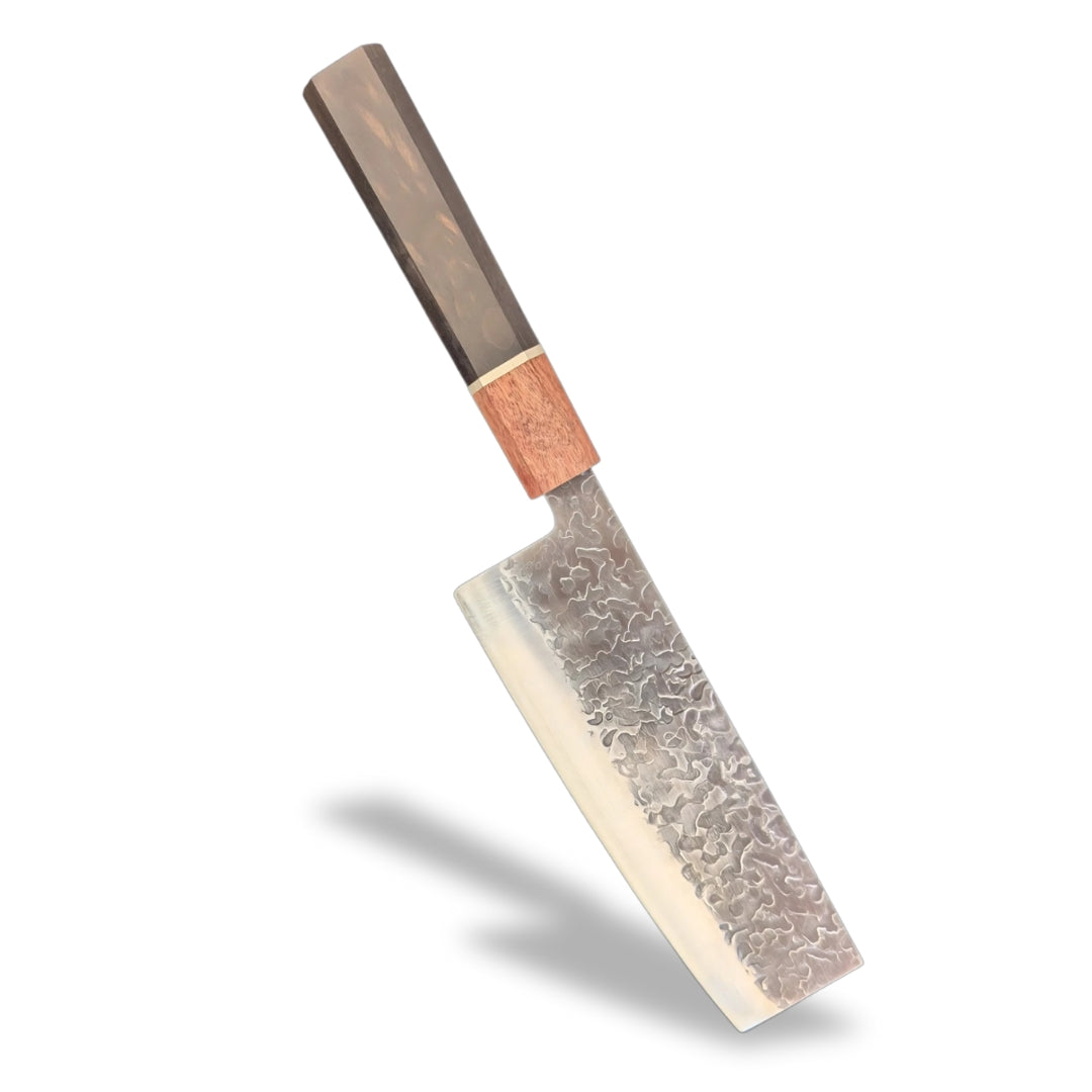 The Nakiri knife is a traditional Japanese blade with a rectangular shape, designed for precise chopping and slicing.